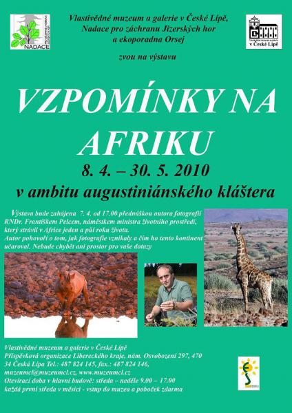 Vlastivědné muzeum a galerie v České Lípě si vás dovoluje pozvat na výstavu nazvanou Vzpomínky na Afriku. Výstava bude zahájena 7. 4. 2010 od 17:00 v ambitu kláštera přednáškou autora fotografií RNDr. Františkem Pelcem, náměstkem ministra životního prostředí, který strávil v Africe jeden a půl roku života. Autor pohovoří o tom, jak fotografie vznikaly a čím ho tento kontinent učaroval. Nebude chybět ani prostor pro vaše dotazy.