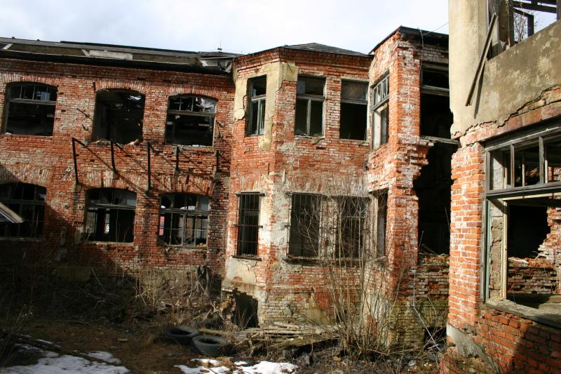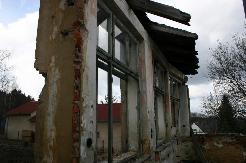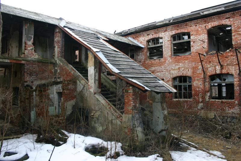 Pomalu se probojovávám do átria celého objektu a cestou zakopávám o lecjaké poklady. Petlahve, sáčky od kdečeho, trámy, ale také střepy z lustrů, jež tu ve vší slávě leží opomenuté časem i lidmi. I pouhé střepy jsou stále krásné. Těch je tu ostatně víc než dost. Vydávám se na zadní nádvoří, kde narážím na další tragicky vyhlížející budovy zdejšího areálu. Celý prostor jakoby žil svým vlastním životem. Všude slyším kapky vody, pomalé chrastění omítky a pukání dřeva; stěny jakoby šeptaly příběhy někdejší slávy, dnes již dávno zapomenuté. Vše působí až morbidně, člověku z toho až začne naskakovat husí kůže, hlavně když mezi neustálým klapáním a rachtáním postřehne pomalu se blížící kroky. Pomalu mi celý objekt začíná připomínat domy z amerických hororů, jako bych neměla právo tudy procházet a vyrušovat mír dávno zašlých dní.