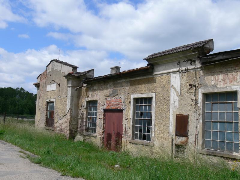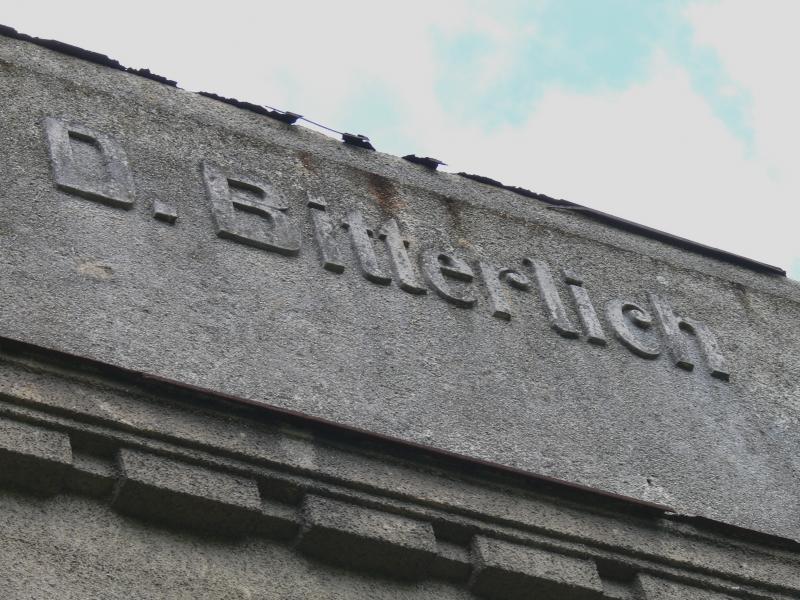 Má číslo popisné 36, snad to byla také továrna. Dva menší komíny se tady hrdě přidávají k těm ostatním ve městě. Čas se zde podepsal velmi silným písmem, rozbitá okna jsou někde zalepená, jinde ne. Ale co je hlavní, kolem je opět nepropustný plot. Dovnitř se podívám alespoň hledáčkem, kolem se vlní tráva a květy kopretin. Místní nás bedlivě sleduje, tak jdeme dál.